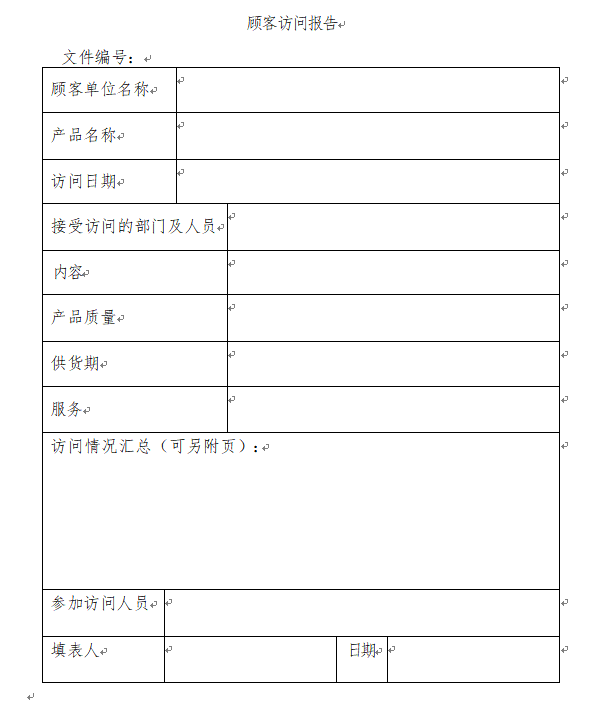 對(duì)顧客的跟蹤訪問(wèn)調(diào)查需填寫《顧客訪問(wèn)報(bào)告》,并要求顧客填寫《顧客滿意度調(diào)查表》。