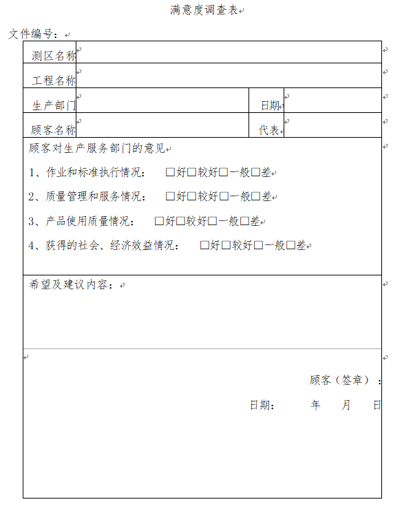 (3) 定期回訪,回訪采用現(xiàn)場(chǎng)查詢回訪形式,回訪時(shí),專職技術(shù)人員應(yīng)全面了解項(xiàng)目質(zhì)量情況,明確回訪內(nèi)容,并虛心聽(tīng)取顧客提出的質(zhì)量意見(jiàn),適當(dāng)時(shí)查看工程質(zhì)量和測(cè)繪產(chǎn)品使用情況 。