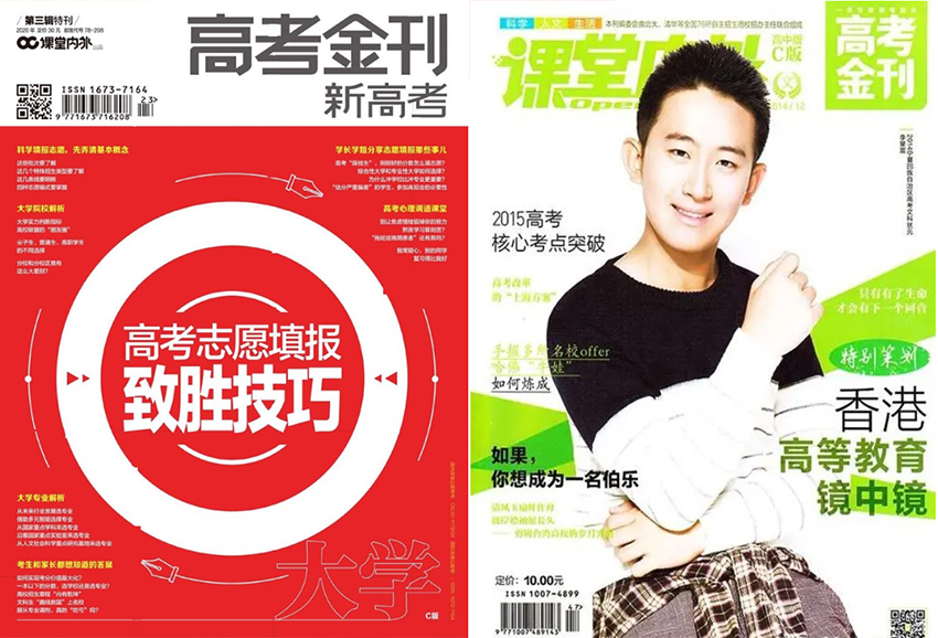 《高考金刊》是課堂內(nèi)外青少年傳媒集團(tuán)旗下的指導(dǎo)高考、輔導(dǎo)學(xué)生、宣傳高校的權(quán)威期刊網(wǎng)站。刊物由教育部關(guān)心下一代工作委員主辦,由北大、清華等53所全國一流重點大學(xué)招辦主任擔(dān)任編委,面向全國考生發(fā)行。它及時傳遞最新高考資訊,被廣大讀者譽(yù)為學(xué)科輔導(dǎo)加油站、志愿填報指導(dǎo)員、高考政策咨詢臺、考生權(quán)益保護(hù)傘?!陡呖冀鹂分苯用鎸忌?,全面宣傳高校。
