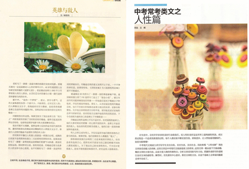 《滿分閱讀》是集閱讀與教學為一體的中學生閱讀期刊,立志做中學生的良師益友,始終以“閱讀豐富人生”為宗旨,讓中學生在課內與課外的閱讀體驗中不斷完美心智,開啟智慧,領略人生。雜志帶你深入古今風云人物鮮為人知的另一面,讓你嘆服時下酷的犀利言辭;演繹真情,我們講述平凡人生那一些觸動靈魂的動人故事;啟智立言,我們?yōu)槟愦蜷_看透世間萬象的心靈之窗;賞閱美文,我們?yōu)槟阒旄∪A忙碌城市中屬于你的一片凈土。