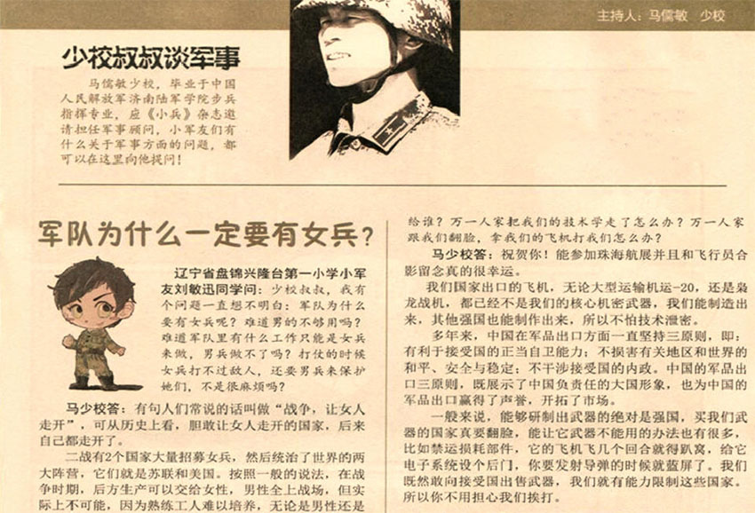 雜志展示各國精良的武器裝備、神秘的軍事基地等,滿足了小軍迷們對軍事裝備和相關知識的渴求;通過講述歷史上著名戰(zhàn)爭的始末,使小讀者們能更生動、具體地了解歷史上的各大戰(zhàn)役,同時,也通過這些故事傳達了戰(zhàn)爭的殘酷,進而激發(fā)他們的愛國情懷。