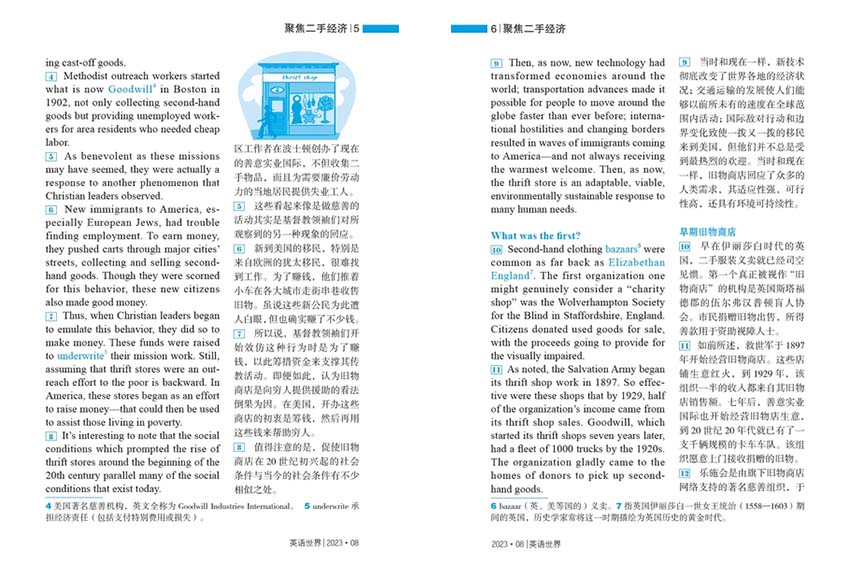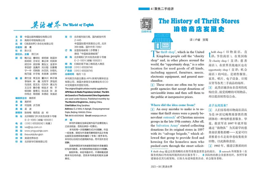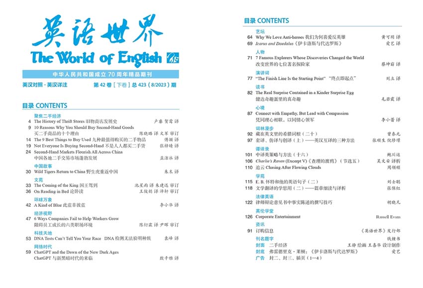 《英語(yǔ)世界》創(chuàng)刊于1981年,該刊是一本面向大學(xué)師生及英語(yǔ)愛(ài)好者的閱讀學(xué)習(xí)類(lèi)刊物。該刊宗旨是文拓視野、譯悅心靈。常設(shè)重點(diǎn)欄目包括:文苑、環(huán)球萬(wàn)象、藝壇、譚譯錄、釋疑解惑等。所選文章英語(yǔ)純正,譯文典范,經(jīng)典而不失趣味,時(shí)尚而不落俗套,介紹并借鑒西方文明的同時(shí),對(duì)中國(guó)文化予以深切的關(guān)照。