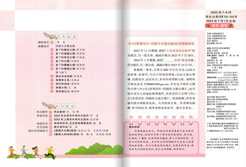 作為一本專注于中學(xué)生閱讀的雜志,《中學(xué)生閱讀》涵蓋了各個層面的內(nèi)容。雜志刊登了文學(xué)經(jīng)典的節(jié)選、名著導(dǎo)讀、文化與歷史背景介紹等,旨在幫助中學(xué)生更好地理解、欣賞和分析文學(xué)作品。同時,它還包括了時事評論、科技與創(chuàng)新、社會問題等議題的文章,以促使中學(xué)生關(guān)注當(dāng)下的社會和世界。此外,雜志還提供寫作指導(dǎo)、閱讀技巧和學(xué)術(shù)資源等方面的內(nèi)容,幫助中學(xué)生提高寫作能力和學(xué)業(yè)水平。